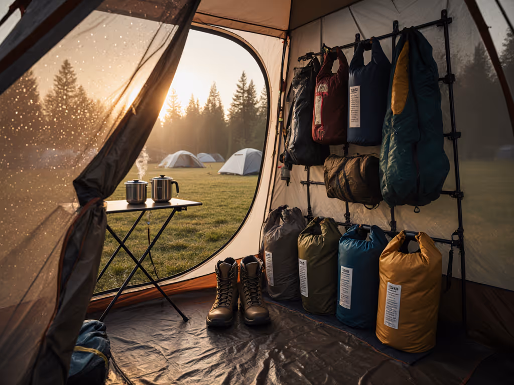- Primary metrics: setup time, interior dryness, liveable space, vestibule coverage, and nighttime adjustability.